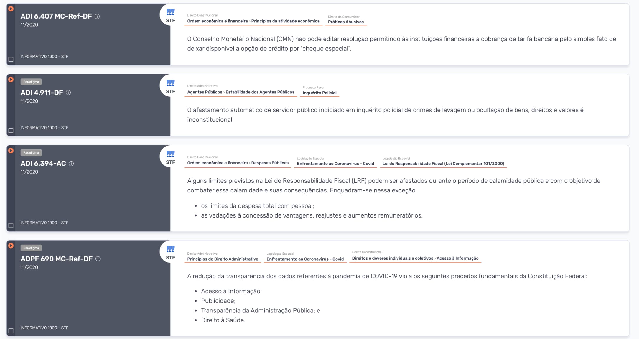 A forma mais fácil e organizada de acompanhar as decisões dos tribunais superiores. Informativos estruturados de forma simples, didática e muito interativa com destaques de repercussão geral, repetitivos e paradigmas.