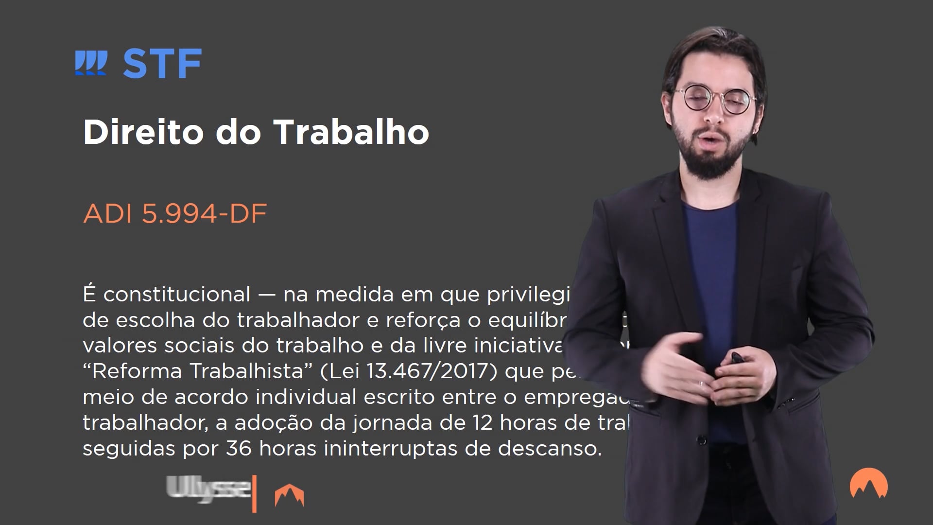 É constitucional — na medida em que privilegia a liberdade de escolha do trabalhador e reforça o equilíbrio entre os valores sociais do trabalho e da livre iniciativa — norma da “Reforma Trabalhista” (Lei 13.467/2017) que permite, por meio de acordo individual escrito entre o empregador e o trabalhador, a adoção da jornada de 12 horas de trabalho seguidas por 36 horas ininterruptas de descanso.