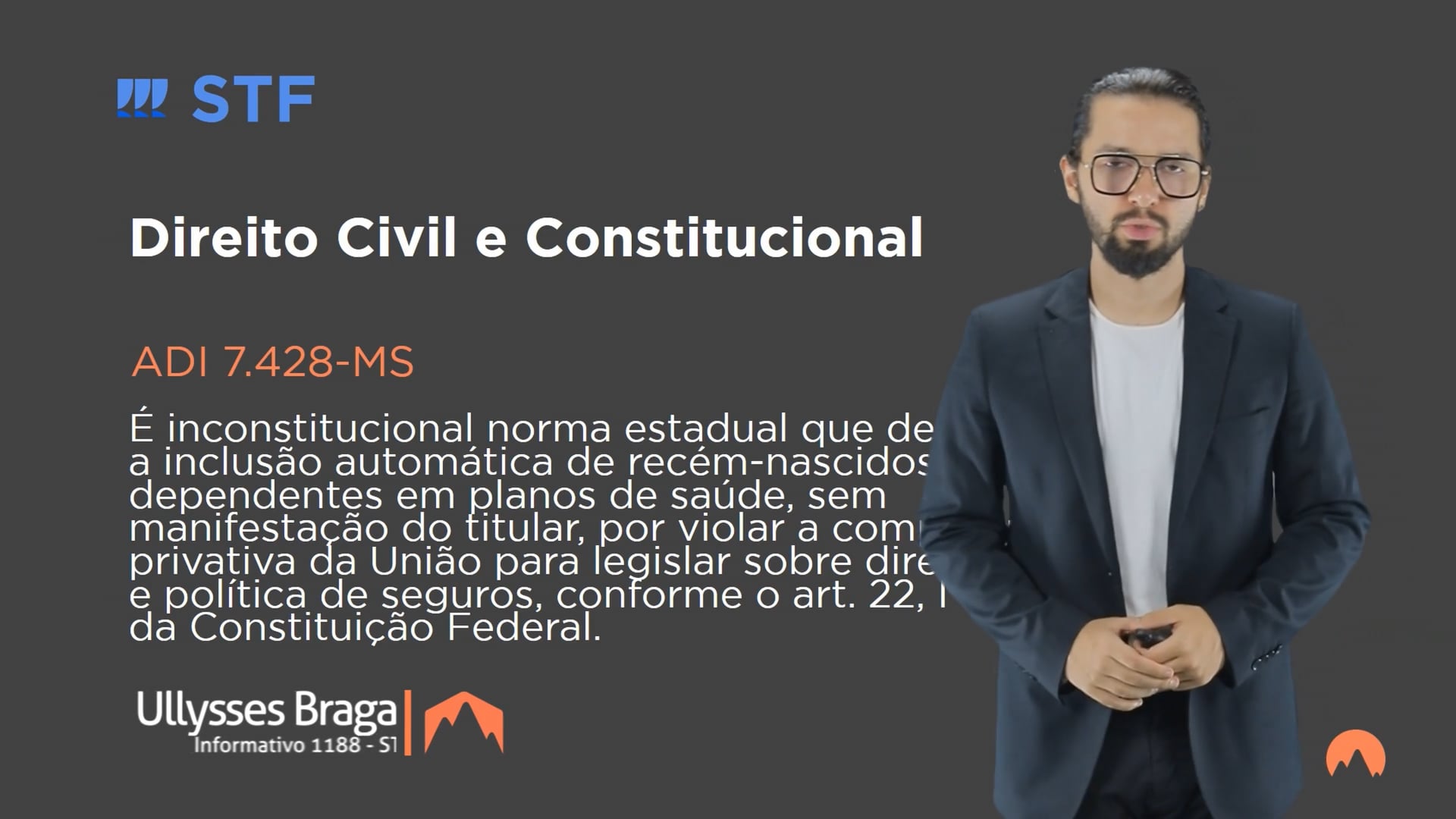 É inconstitucional — por violar a competência privativa da União para legislar sobre direito civil e política de seguros (CF/1988, art. 22, I e VII) — norma estadual que determina a inclusão automática de recém-nascidos como dependentes em planos de saúde, independentemente de manifestação de vontade do titular da cobertura.