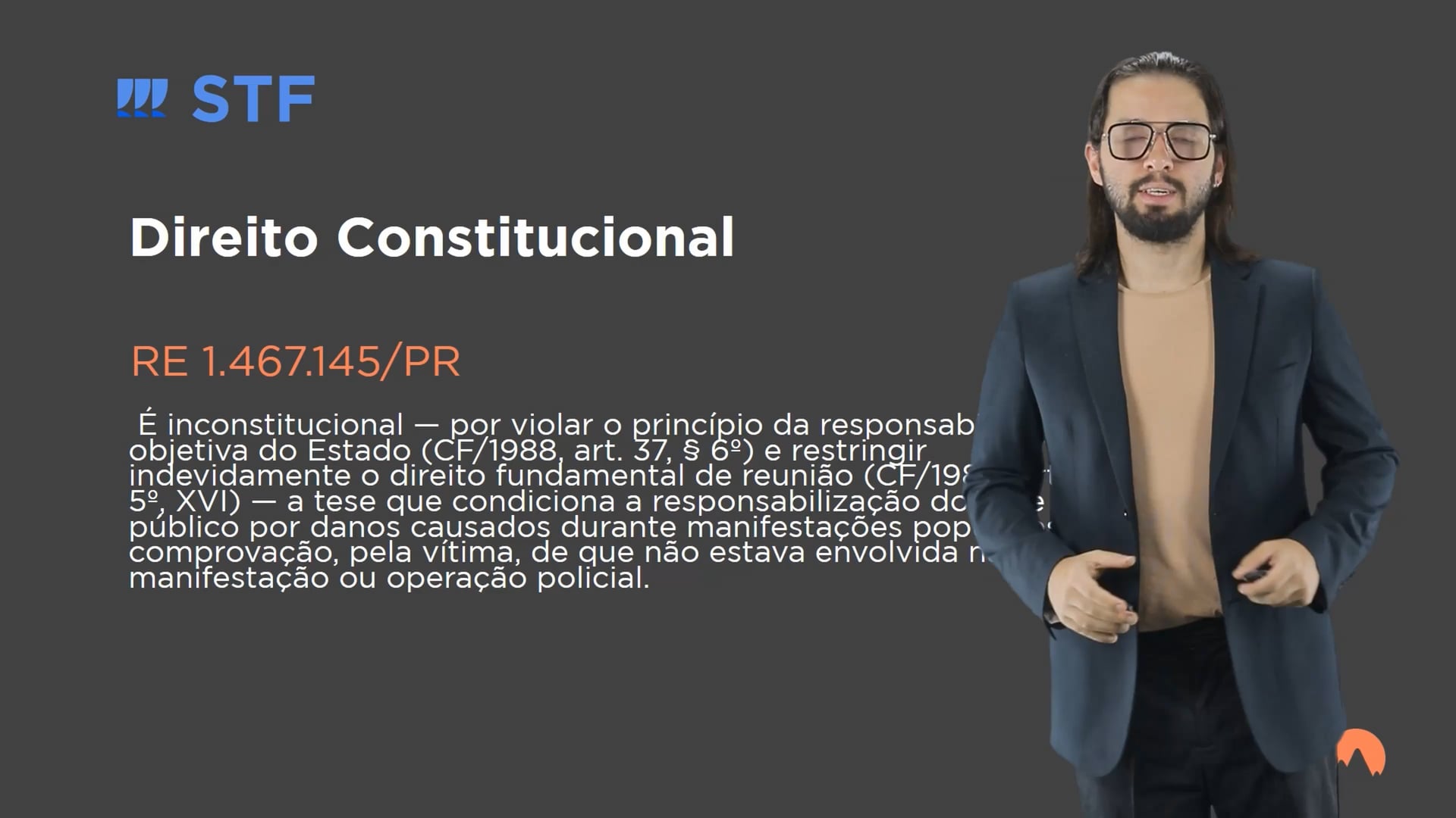 É inconstitucional — por violar o princípio da responsabilidade objetiva do Estado (CF/1988, art. 37, § 6º) e restringir indevidamente o direito fundamental de reunião (CF/1988, art. 5º, XVI) — a tese que condiciona a responsabilização do ente público por danos causados durante manifestações populares à comprovação, pela vítima, de que não estava envolvida na manifestação ou operação policial.
