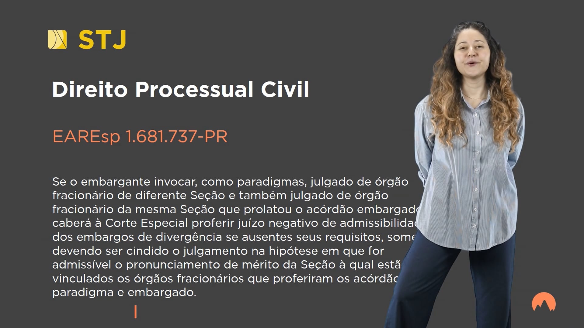 Posteriormente, passou-se a admitir que a Corte Especial também possa se pronunciar sobre o juízo de admissibilidade dos embargos de divergência nas hipóteses em que existam paradigmas de órgãos fracionários da mesma Seção e de diferentes Seções, consignando-se que "não deve ser seccionado o julgamento para que uma Seção profira outra decisão em embargos de divergência em que a Corte Especial - órgão de hierarquia jurisdicional mais elevada deste Superior Tribunal -, ou um de seus ministros com competência monocrática, conclui que o mérito do pedido recursal não pode ser analisado por ser inadmissível o recurso" (AgRg nos EAREsp 155.081/SC, Corte Especial, DJe 06/05/2016). No mesmo sentido: AgRg nos EAREsp 593.919/PR, Corte Especial, DJe 23/11/2018, AgInt no AgInt nos EREsp 1.305.165/RJ, Corte Especial, DJe 11/03/2021 e AgInt nos EAREsp 673.112/TO, Corte Especial, DJe 09/03/2022.