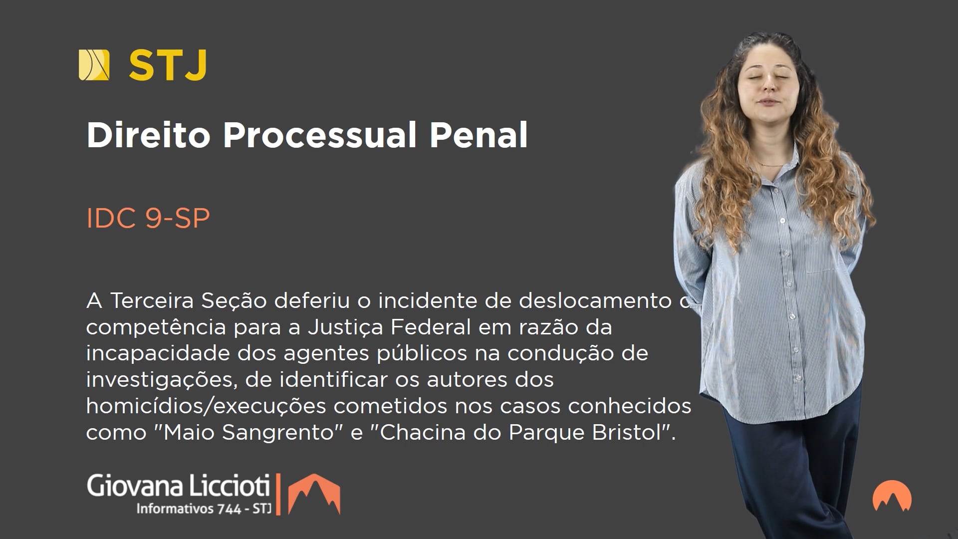 A Terceira Seção deferiu o incidente de deslocamento de competência para a Justiça Federal em razão da incapacidade dos agentes públicos na condução de investigações, de identificar os autores dos homicídios/execuções cometidos nos casos conhecidos como "Maio Sangrento" e "Chacina do Parque Bristol".