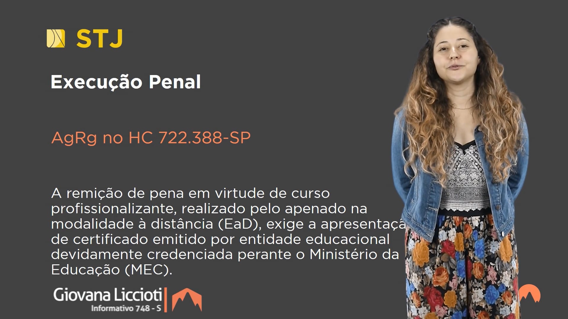 A remição de pena em virtude de curso profissionalizante, realizado pelo apenado na modalidade à distância (EaD), exige a apresentação de certificado emitido por entidade educacional devidamente credenciada perante o Ministério da Educação (MEC).