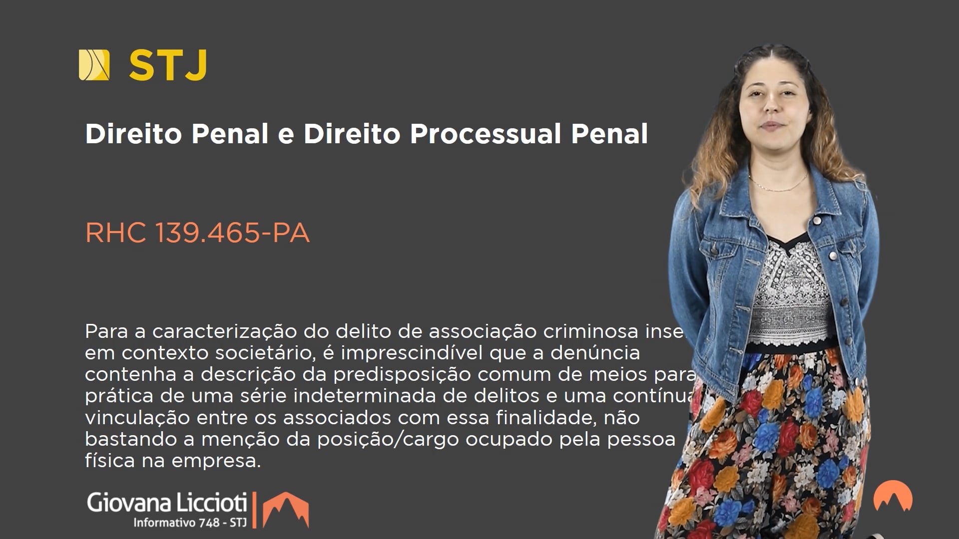 Para a caracterização do delito de associação criminosa inserido em contexto societário, é imprescindível que a denúncia contenha a descrição da predisposição comum de meios para a prática de uma série indeterminada de delitos e uma contínua vinculação entre os associados com essa finalidade, não bastando a menção da posição/cargo ocupado pela pessoa física na empresa.