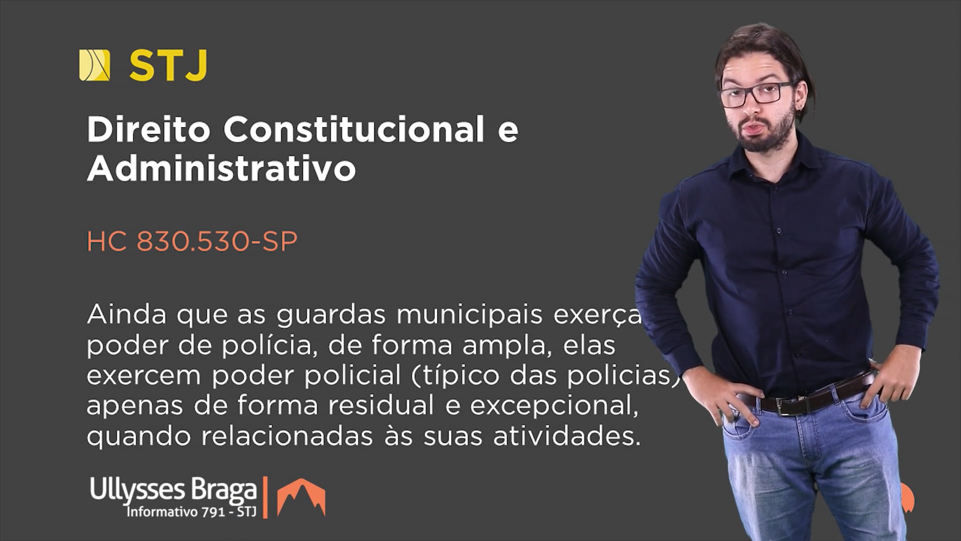Conquanto não sejam órgãos policiais propriamente ditos, as guardas municipais exercem poder de polícia e também algum poder policial residual e excepcional dentro dos limites de suas atribuições. A busca pessoal - medida coercitiva invasiva e direta - é exemplo desse poder, razão pela qual só pode ser realizada dentro do escopo de atuação da guarda municipal.