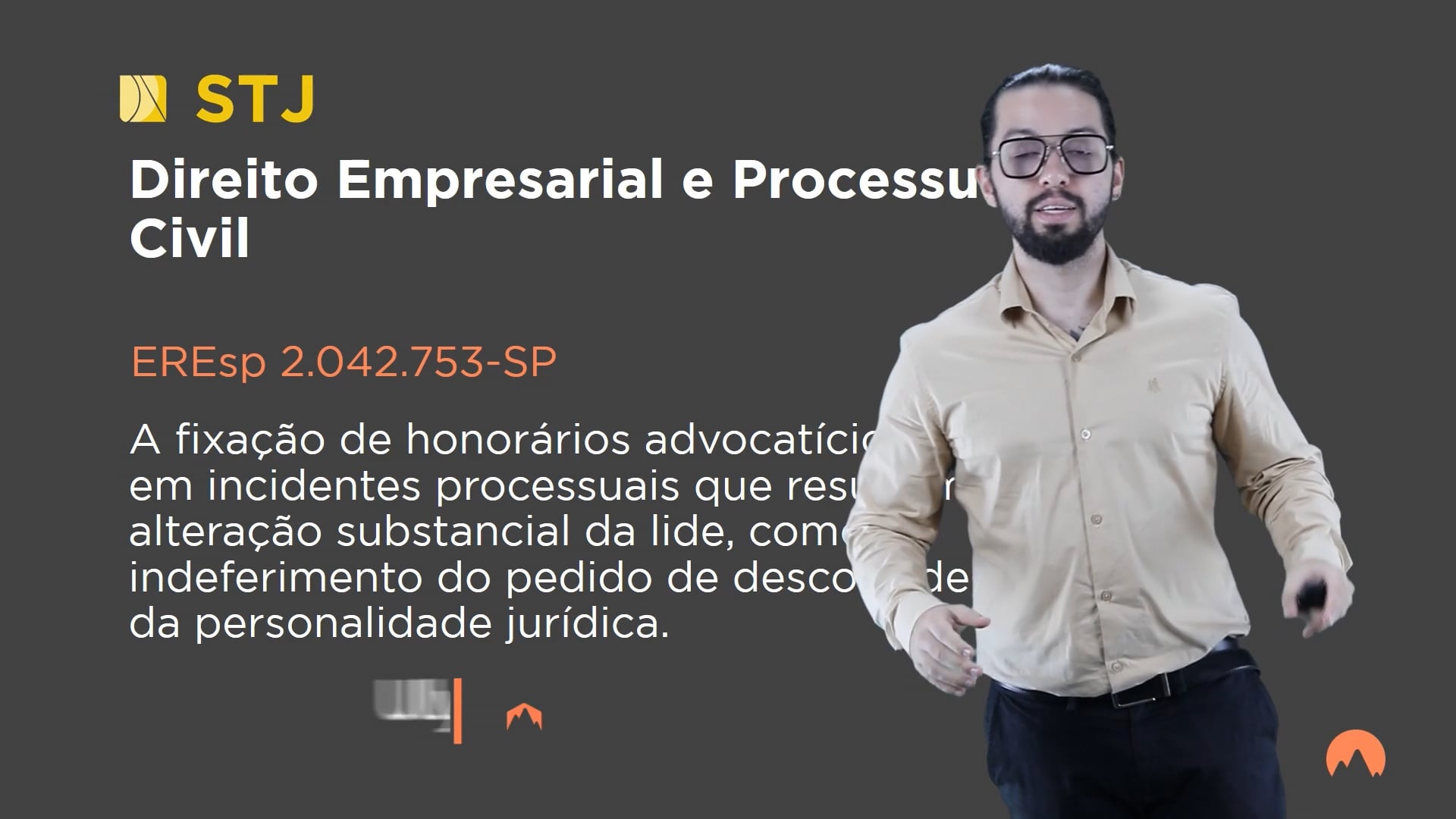 Em recente precedente da Primeira Turma do STJ (AgInt no REsp 2.114.186/SE, Rel. Ministra Regina Helena Costa, DJe de 11/4/2024), o incidente de "desconsideração da personalidade jurídica" não representou a extinção do processo principal e nem a sua alteração significativa. Por isso, não foi acompanhado de honorários advocatícios sucumbenciais. Em situação semelhante, a Terceira Turma do STJ também declarou a impossibilidade de fixação de honorários advocatícios sucumbenciais no julgado relacionado à desconsideração da personalidade jurídica (AgInt no REsp 1.933.606/SP, Rel. Ministro Paulo de Tarso Sanseverino, DJe de 24/2/2022).