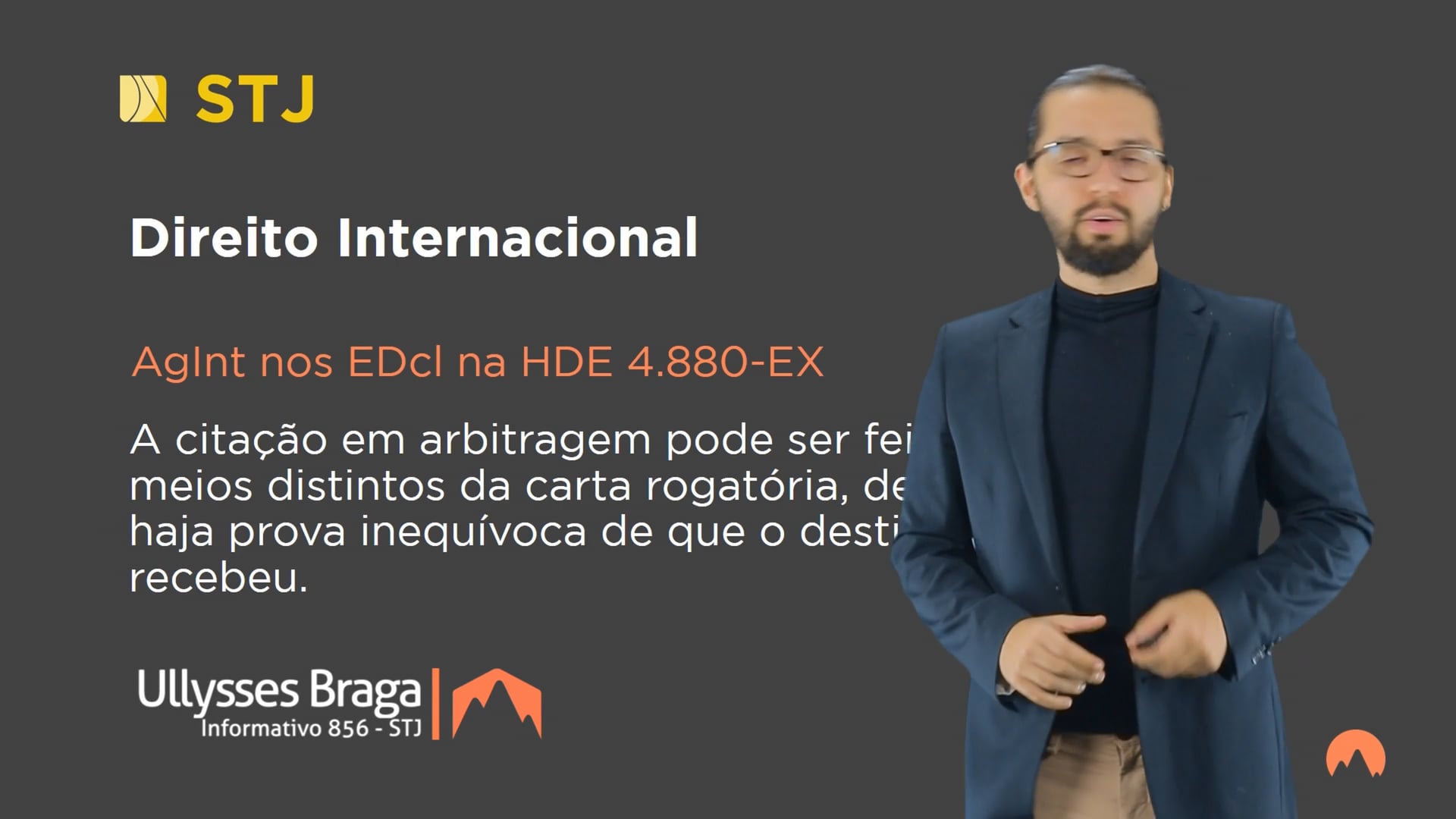 Em se tratando de homologação de decisão estrangeira originada de procedimento arbitral, o STJ entende que a tomada de conhecimento do processo pode ocorrer por meios diversos que não a carta rogatória, sendo possível inclusive que seja feita por carta com aviso de recebimento ou courrier internacional (SEC 9.820/EX, rel. Ministro Humberto Martins, Corte Especial, julgado em 19/10/2016, DJe de 26/10/2016; SEC 12.041/EX, rel. Ministro Humberto Martins, Corte Especial, julgado em 7/12/2016, DJe de 16/12/2016; e Aglnt na HDE 4.174/EX, rel. Ministro Herman Benjamin, Corte Especial, julgado em 7/3/2023, DJe de 4/4/2023).