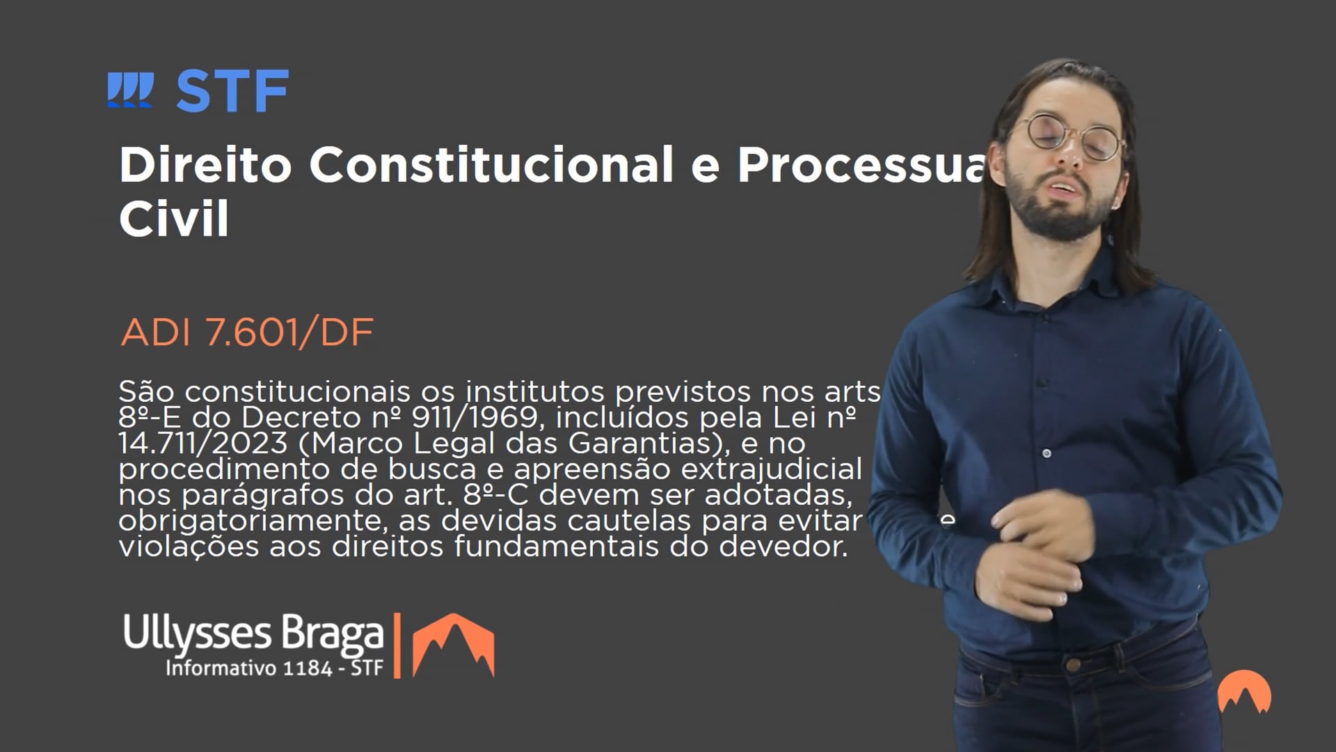 São constitucionais os institutos previstos nos arts. 8°-B ao 8º-E do Decreto nº 911/1969, incluídos pela Lei nº 14.711/2023 (Marco Legal das Garantias), e no procedimento de busca e apreensão extrajudi- cial previsto nos parágrafos do art. 8º-C devem ser adotadas, obriga- toriamente, as devidas cautelas para evitar graves violações aos direi- tos fundamentais do devedor.