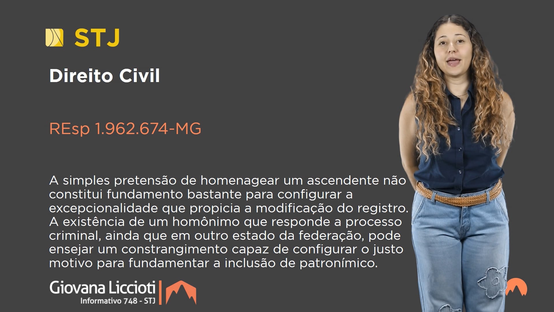 Deve-se destacar que o recorrente é advogado atuante na área criminal e professor universitário de direito processual penal, de modo que a existência de um homônimo que responde a processo criminal, ainda que em outro estado da federação, pode ensejar um constrangimento capaz de configurar o justo motivo para fundamentar a inclusão do patronímico pretendido.