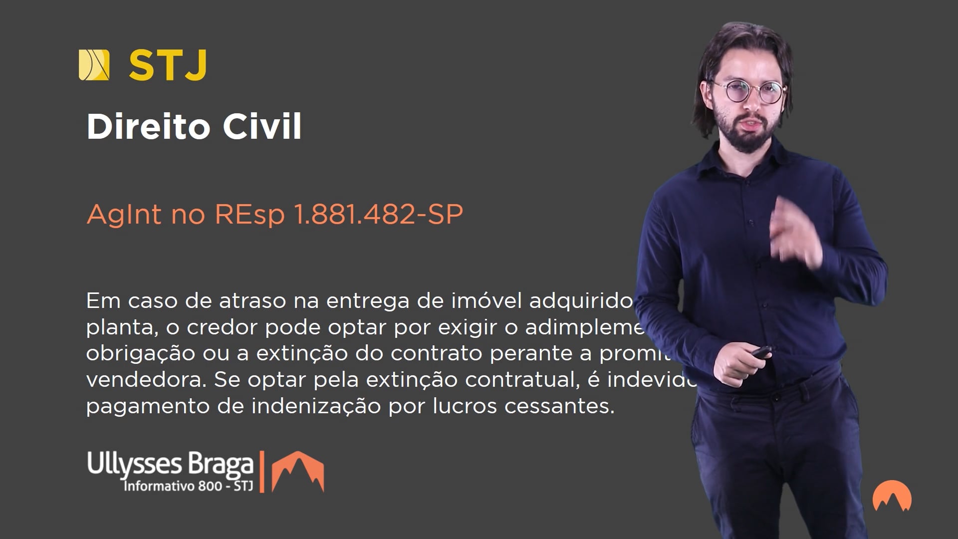 Em caso de atraso na entrega de imóvel adquirido na planta, o credor pode optar por exigir o adimplemento da obrigação ou a extinção do contrato perante a promitente vendedora. Se optar pela extinção contratual, é indevido o pagamento de indenização por lucros cessantes.