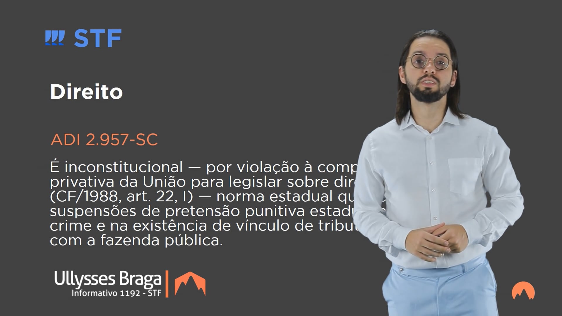 É inconstitucional — por violação à competência privativa da União para legislar sobre direito penal (CF/1988, art. 22, I) — norma estadual que causa suspensões de pretensão punitiva estadual em crime e na existência de vínculo de tributação com a fazenda pública.