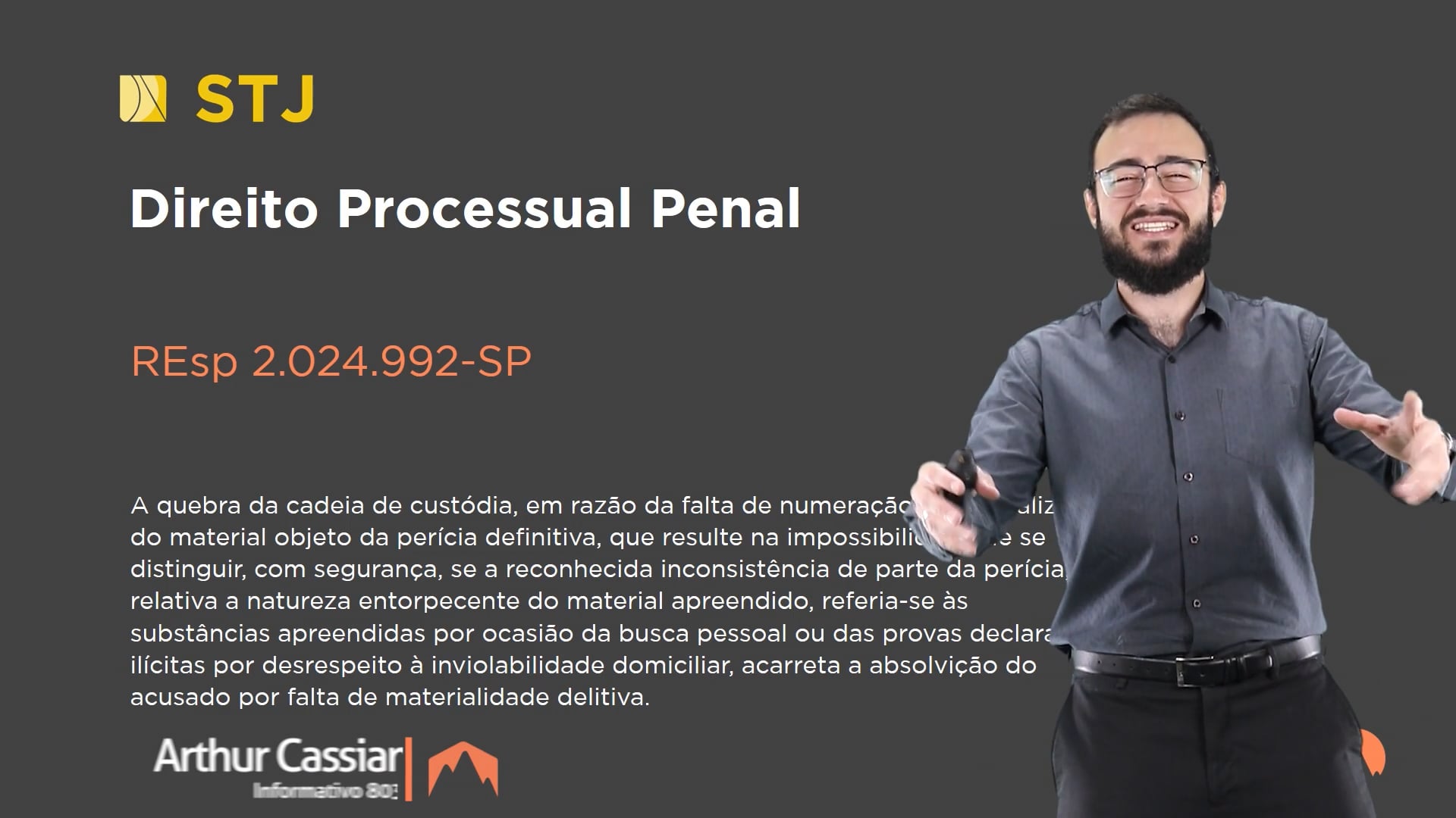 A quebra da cadeia de custódia, em razão da falta de numeração individualizada do material objeto da perícia definitiva, que resulte na impossibilidade de se distinguir, com segurança, se a reconhecida inconsistência de parte da perícia, relativa a natureza entorpecente do material apreendido, referia-se às substâncias apreendidas por ocasião da busca pessoal ou das provas declaradas ilícitas por desrespeito à inviolabilidade domiciliar, acarreta a absolvição do acusado por falta de materialidade delitiva.