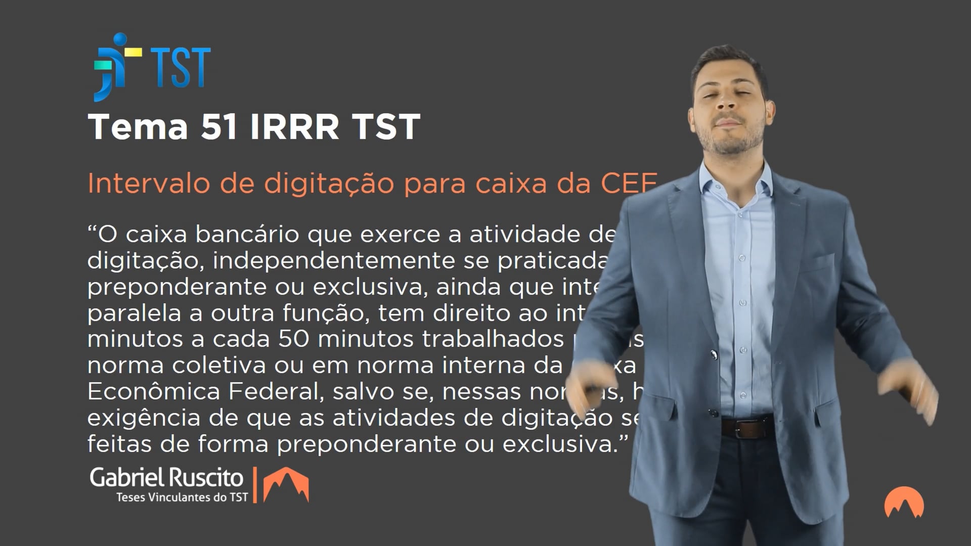 O caixa bancário que exerce a atividade de digitação, independentemente se praticada de forma preponderante ou exclusiva, ainda que intercalada ou paralela a outra função, tem direito ao intervalo de 10 minutos a cada 50 minutos trabalhados previsto em norma coletiva ou em norma interna da Caixa Econômica Federal, salvo se, nessas normas, houver exigência de que as atividades de digitação sejam feitas de forma preponderante ou exclusiva.